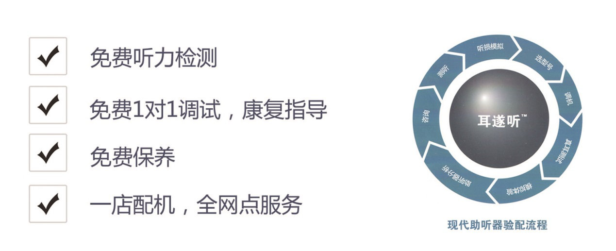 各连锁专业服务中心拥有经验丰富的专业验配师和世界先进的听力检测仪器及助听器专业验配设备,为听障患者提供优质到位的服务。对聋儿能进行自由声场测试及助听器效果评估。对行动不便者可预约上门服务,帮助听障朋友重返精彩的有声世界。